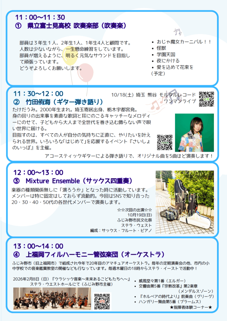 吹奏楽・オーケストラ・ギター弾き語り・J-POPカバーなど、多彩なジャンルの音楽が一日中楽しめます。