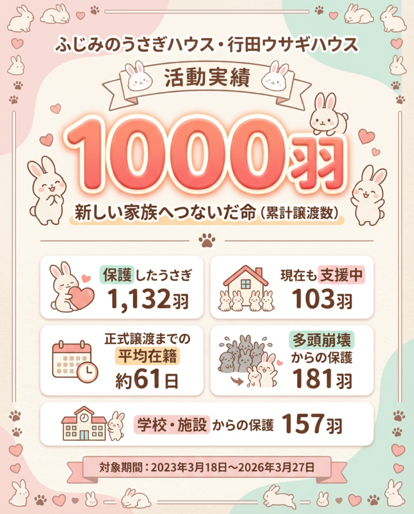 うさぎハウスは活動開始以来、累計1000匹のうさぎさんを里親さんへとつなぐことができました。